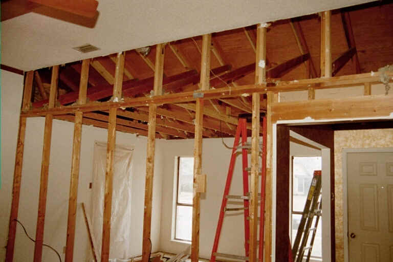 | February 2001 | Move furniture and decorations out of the center third of the house. Hang dust shields on doorways. Contractors knock out dining room wall and ceiling and replace it with a beam. |